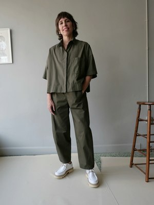 The Alba Pant by Shaina Mote features a classic barrel leg shape with wrap-around side panels and an easy elastic waistband. Designed with in-seam front pockets and back patch pockets. Crafted from medium-weight organic cotton twill. True to size fit. Made in Lithuania. (100% organic cotton) Caroline is 510" with a 36 inch bust measurement, a 29 1/2 inch waist, and a 40 inch hip. She is wearing the size small.