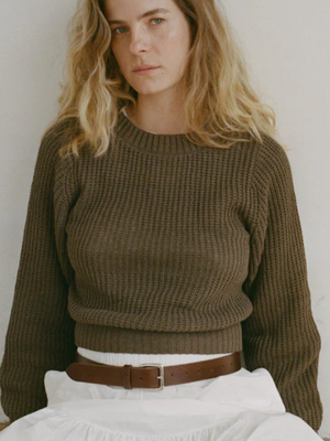 A perfect spring or summer light knit layer featuring a classic waffle knit texture with rib cuff, hem, and collar details. Cropped yet relaxed shape. This sweater is made in cotton and linen, giving it a breathable, soft, and lightweight feel with excellent drape. Designed for layering under jackets or worn on top of light layers in the spring and summer months. Bark is a warm, neutral brown. Made in Peru with 60% Pima Cotton, 40% Linen. Care: Spot clean or hand wash cold, lay flat to dry. True to size, relaxed fit. Zaga wears a size Small / 4. Measurements are bust 34", waist 27", hips 37.5".