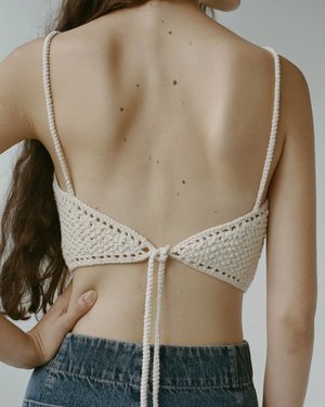 The Sansa Top is a cropped, apron-style halter top crocheted by hand in organic cotton. It features a small open lace-style edge stitch and a textured knubby feel knit stitch at the body. Adjustable waist ties. Details: 100% Organic Tanguis Cotton Made in Peru.