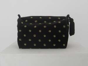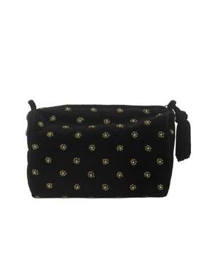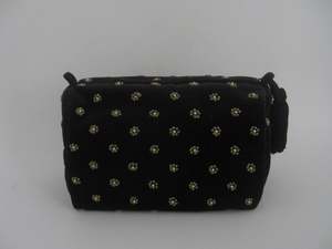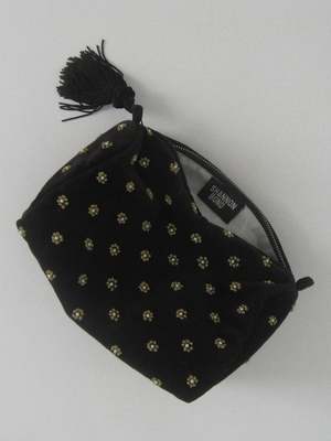 Cotton velvet cosmetic bag with tassel zipper puller and allover pearl and gold metallic thread hand embroidery. Four interior pockets and one main pocket. Synthetic non-fabric lining is durable for cosmetics or bodycare products. Color: Black Materials: Cotton Velvet
