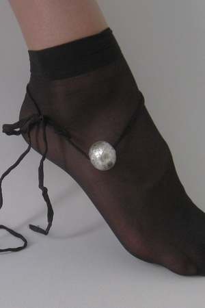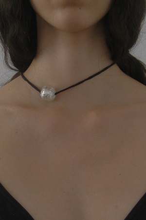 Black silk cord necklace with metallic silver Italian glass bead. Can be worn as a bracelet, anklet, or necklace. Materials: Silk, Glass. Pairs well with the Lalique Ring in Black/Silver.