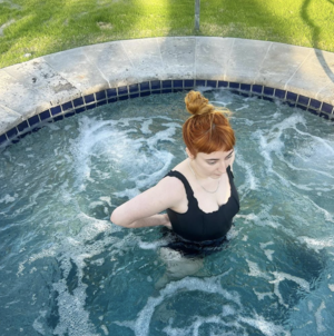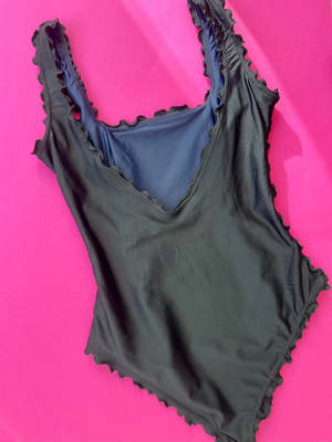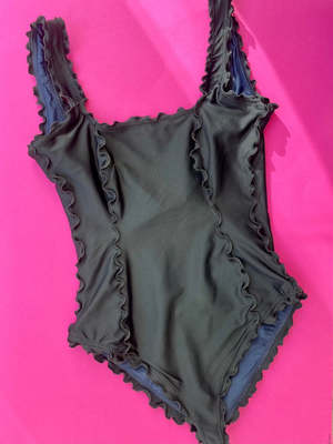 A square neckline full corset one-piece bathing suit, with lettuce edge finishings. V back. Medium bum coverage. Square neck line is flatter for all bust sizes. Doubles as a bodysuit! 4-way stretch fabric 80% nylon 20% spandex Sustainably made in NY Please note: each item is handmade and will vary in color variation and placement of patches. These are made with zero-waste patternmaking methods, utilizing all leftover fabrics within her studio therefore making each piece one-of-a-kind.