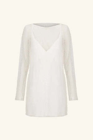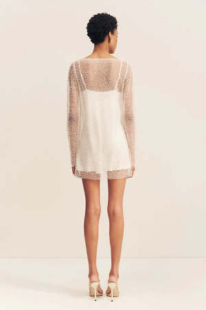 Long sleeve mini dress in ivory featuring a sheer beaded mesh with a boat neckline and A-line mini skirt. The dress has long slim sleeves, a lightweight non-stretchy woven construction, and a mini slip lining. The style features a raw hem that can be easily shortened to suit your preference. Fabric Details: - Main: 100% Nylon Beaded Tulle - Contrast: 100% Nylon - Lined: 62% Viscose, 38% LENZING ECOVERO Viscose Due to the delicacy of this material, avoid contact with rough surfaces and jewellery. Fit: - Slim fit; designed to skim the body - Centre front hem: 78cm/30.7" - Measurements taken from size US2 - Model Alyssa wears a US2 (Height: 180 cm/511, Bust: 80 cm/31.5", Waist: 60 cm/23.5", Hips: 86 cm/34")