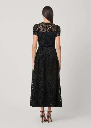 Timeless evening dress made in a beautiful velvet lace fabrication. The yoke and sleeves are sheer for added detail, while the bodice and skirt are lined. A velvet ribbon bow accentuates the waistline. Ankle length. Center back invisible zipper closure. 100% Polyester. Dry clean only.