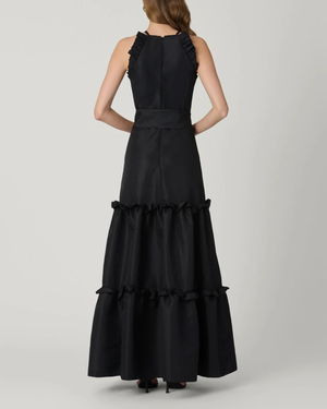 Gorgeous evening gown made in black moir fabric, with ruffle details at the neckline and skirt. The bodice has a cut-in neckline and interior boning for added support. Adjustable belt tie at the waist. Voluminous full-length skirt. Center back invisible zip closure. Fully lined. 100% Polyester. Dry clean only. Approximately 57" in length.