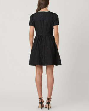 Lovely cocktail dress in a black textured jacquard. Features a round neckline with beautiful jewel embellishments and short puffed sleeves. Form-fitted bodice and shirred full volume mini skirt with side pockets. Fully lined. Hidden back zipper.