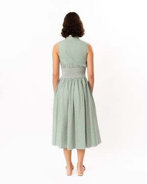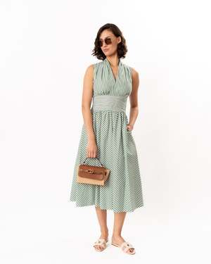 Chic cotton midi dress made in striped poplin fabric. This style features pleating around the neckband, a V-neckline, and a ruched waistband. The skirt is cut on the bias to form a chevron pattern with the stripes, with smocking at the back waist for a smooth fit. Center back invisible zip closure. Unlined. Care: 74% Cotton, 21% Nylon, 5% Elastane. Dry clean. Approximately 48" in length.