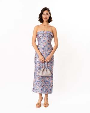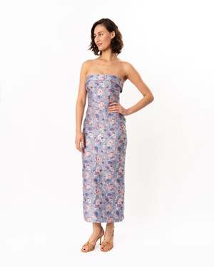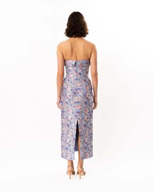 This cute evening dress is made in a beautiful floral jacquard fabric. The bodice is fitted, and the ankle-length skirt has a pencil silhouette. The dress is fully lined, and the bodice features an interior bustier with boning for added support. Center back invisible zip closure. Care: Dry clean only. Composition: 85% Polyester, 15% Nylon. Approximately 43.75" in length.