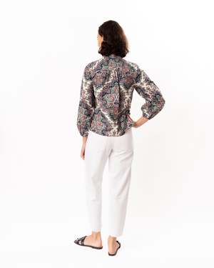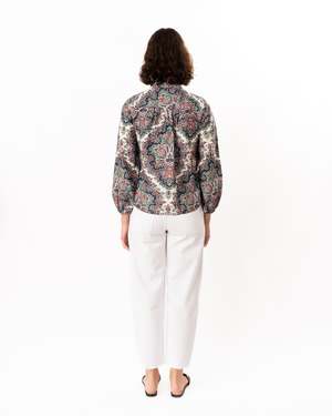 Button-front top in printed cotton fabric. Features a front placket with navy buttons for closure, full-length sleeves with an elastic casing at the sleeve opening, and a curved shirttail hemline. Unlined. Fabric: 97% Cotton, 3% Spandex. Care: Dry clean.