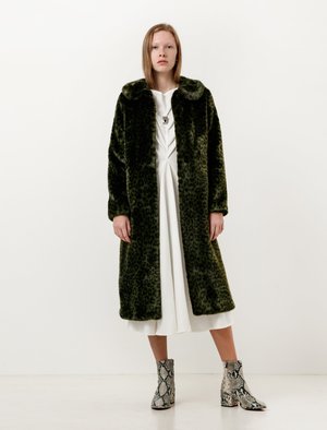 Cut extra long, this coat is cut from a super soft and light faux fur. Unlike other, bulkier faux furs, this season Shrimps has worked to reduce the volume, making them extra wearable. We love the rounded collar and the invisible closures, which don't distract from the beautiful green leopard print. - 100% acetate - Lined - Dry clean only - Model is 5'10"; bust 33"; waist 27.5"; hips 36"; wears a size 8