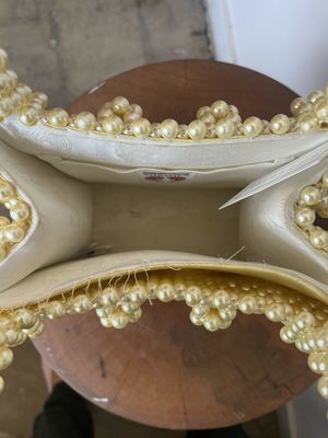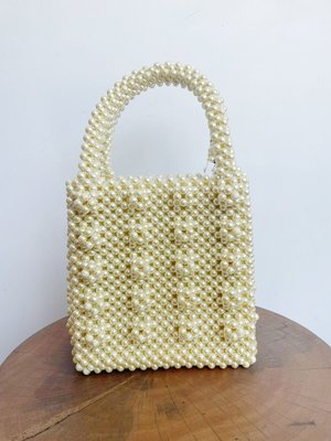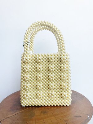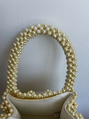SIZE Small MATERIAL 100% plastic pearls. 65% Acetate, 35% Viscose Lining DETAILS Rare, sold out style / color! Retails for $700 Color: Cream / butter yellow Structured small bucket bag with two top handles Shiny powder blue faux pearls adorn entire exterior of bag including bottom side and top handles Designed with a subtle three-dimensional cluster pattern at front, back, and gussets Interior is fully lined with tonal satin Includes single wide patch pocket at interior sizable for most cell phones Incorporating elements of classic 50s design Open top Made in India MEASUREMENTS 7.5" H x 7" W x 4" D Drop handles 5" CONDITION Good condition. Lining coming undone, loose threads Comes with NA