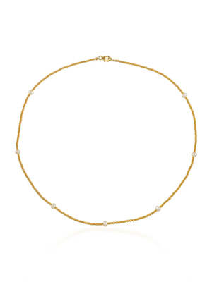 The Cami Necklace by Shyla is formed of a beaded gold and lapis stone design. Elegant in style, this necklace can be worn individually or stacked with other pieces. It measures 18 inches (45.72 cm) in length and features a slim, practical, and elegant design. Material: 22 carat gold on sterling silver with lapis stones.