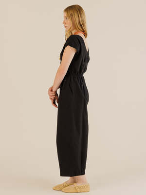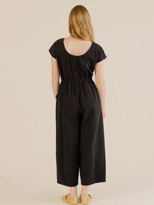 The Daisy Jumpsuit in black from Sideline is fitted at the waist with a wide elastic waistband but a flat front to keep the front clean and neatly fitting. The jumpsuit has a high curved front neckline with a low scoop at the back (covering a bra), a capped sleeve, and a button back. This style has a loose barrel leg shape, slightly tapered at the hem. The Daisy Jumpsuit features slant side pockets and a single back patch pocket. - Wide elastic waistband - Capped sleeve - Button back - Barrel leg shape, slightly tapered at hem - Slant side pockets - Single back patch pocket Model is 58", size UK 10, and is wearing a size S.