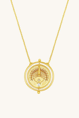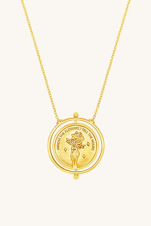 This double-sided spinner necklace is inspired by ancient sundials. One side inscribed with "AMIDST THE FLOWERS I TELL THE HOURS", a favorite motto on some sundials. The Hours Necklace was designed to embrace the moment. It is a reminder to pause amid the chaos, smell the flowers, and be present. - Gold Vermeil & White Topaz - 18" Long, Extends to 20" ; 1" Pendant Diameter