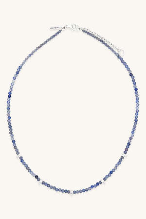 A colorful beaded necklace handmade by Sierra with silver accents and faceted iolite. Materials: Iolite and sterling silver. Length: 1618".