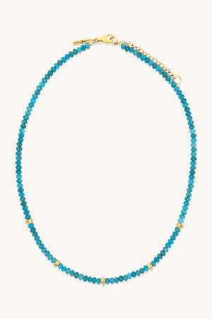 A colorful beaded necklace handmade by Sierra with gold accents and faceted apatite. Apatite & 18k Gold Vermeil. Length: 1618".
