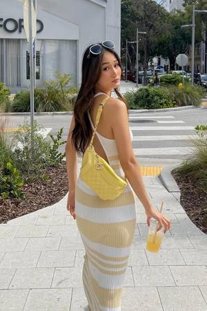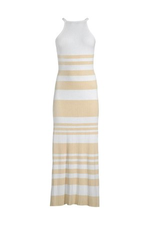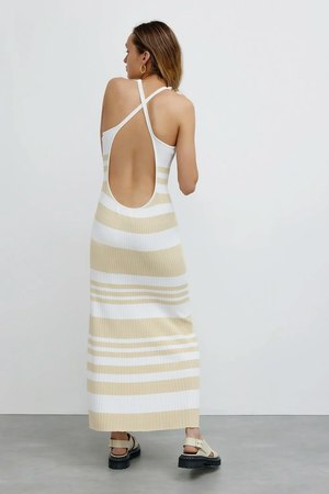 Designed to be versatile, the Sage Dress is perfect for layering on cooler nights. Cross-over straps with a low scooped backline complement the two-tone knit fabrication. Pair with slides and opt for a light denim jacket on cooler nights. As seen on @lilikaramalikis, @prettyfrowns, and @xmiapm. - Halter neckline. - Cross-over straps. - Low scooped backline. - Sleeveless. - Fitted at the bodice. - Pull-on style. - Midi dress. - Unlined. - Color: Almond and cream stripe. - Two-tone midweight stretch knit fabrication. - Material: 86% Viscose rayon, 14% Nylon. - Length: 56" (142 cm). Measured from size AU 8 (US 4, Size S). - Model is wearing AU 8 (US 4, Size S) - She is 5'9.5" (177 cm) tall. Bust 32" (81 cm). Waist 23.5" (60 cm). Hips 35" (89 cm). - Hand wash cold or dry clean. Do not tumble dry. Warm iron. - Designed in Australia.