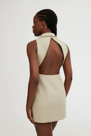 A utility-inspired silhouette - perfect for layering. The Ebony Vest can be worn as a dress or top. Crafted from a bonded fabrication for a structured finish, featuring open back detail, collared neckline, and button front closure. - Collared V neckline. - Sleeveless. - Button front closure. - Open back. - Button front closure. - Fitted silhouette. - Can be worn as a dress or top. - Mini dress. - Lined. - Color: Sage pinstripe. - Midweight bonded suiting fabrication. - Material: Shell - 94% Polyester, 5% Elastane, 1% Viscose; Lining - 100% Polyester. - Model is wearing AU 8 (US 4, Size S) - She is 57 (175 cm) tall. Bust 32 (81 cm). Waist 23" (58 cm). Hips 34 (86 cm). -Hand wash cold. Warm iron. - Designed in Australia.