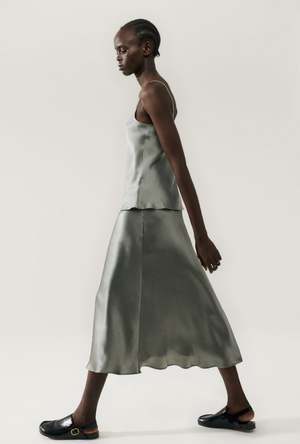 Silk Laundry bias skirt crafted in 100% silk detailed with elasticated waistband. Cut on the bias with an ankle length fit. - Material: 100% Silk Sandwashed, 16 momme - Care: Hand wash in cold water or dry clean - Matte sheen - Cut on the bias - Elasticated waistband - Ankle length - Internal French seams - OEKO-TEX certified - Fits true to size - Ajak is 183cm / 6'0 and wears a size medium