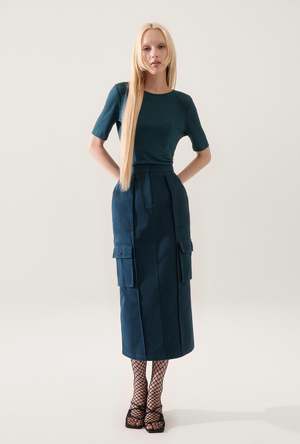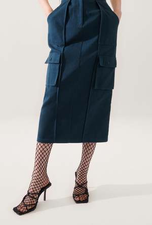 Silk Laundry Cargo Skirt, crafted from 100% BCI organic cotton twill with a soft wash finish. This skirt features a functional adjustable elastic waist, ample storage with front patch, side, and back pockets, and a fly front for ease of wear. - Material: 100% Organic Cotton - BCI Organic Cotton, 7x7 twill - Soft wash - Functional adjustable elastic at waist - Front patch pockets - Front fly opening - Finished with internal French seams - Back skirt vent - Finished with internal French seams - OEKO-TEX certified- Certified organic cotton yarn - Fits true to size - Model wears a size small