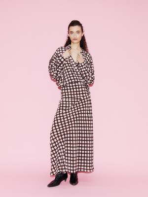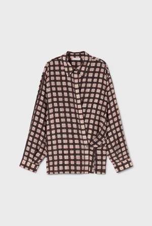Effortless draping. Crafted from 16MM 100% Silk CDC (Crepe de Chine) Sandwash, this shirt has a soft matte texture and an airy, sculptural feel. Designed for versatile styling, it can be worn crossed, open, or secured with the internal side buttons, creating a relaxed yet elegant silhouette. Long, rounded sleeves. Crossover shirt with two internal side buttons to secure the fit. Placket with buttonholes at collar and waist. Internal French seams for a refined finish. Fits true to size. Material: 100% Silk CDC, OEKO-TEX Certified. Color: Luna Gingham. Care: Hand wash in cold water, use delicate detergent, line dry in shade; or dry clean if necessary.