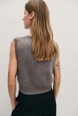 The V-Neck Sweater Vest by Silk Laundry is made from 100% Merino Wool. It features a sleeveless, cropped silhouette with a ribbed neckline and hem, and mother of pearl embellishment. The vest fits true to size and is OEKO-TEX certified. Model is 177cm tall and wears a size medium. Care information: - Gentle dry clean - Do not wash - Do not tumble dry - No bleach or fabric softeners - Please wash no more than necessary to increase the life of your garment.