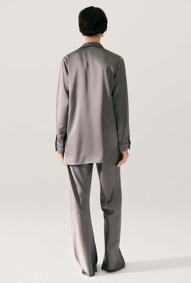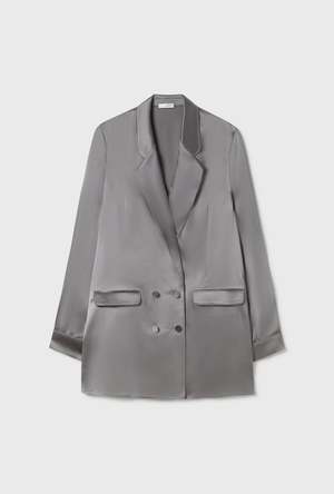 Silk Laundry blazer crafted in 100% silk detailed with a deep collar, silk-covered buttons and pockets. Cut with a loose silhouette for a relaxed fit. - Material: 100% Silk, 19 momme - Deep V collar - Glossy sheen - Silk covered buttons - Unlined for drape - Internal French seams - OEKO-TEX certified - Fits true to size - Model wears a size medium