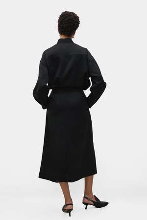 Silk Laundry wool wrap skirt, tailored from 100% wool. This skirt features a functional wrap design, side seam pockets, and a back vent opening. - Material: 100% Silk Sandwashed, 16 momme - Functional wrap - Matte sheen - Side seam pockets - Back vent opening - Metal hardware trims - Internal French seams - OEKO-TEX certified - Fits true to size - Model wears a size medium