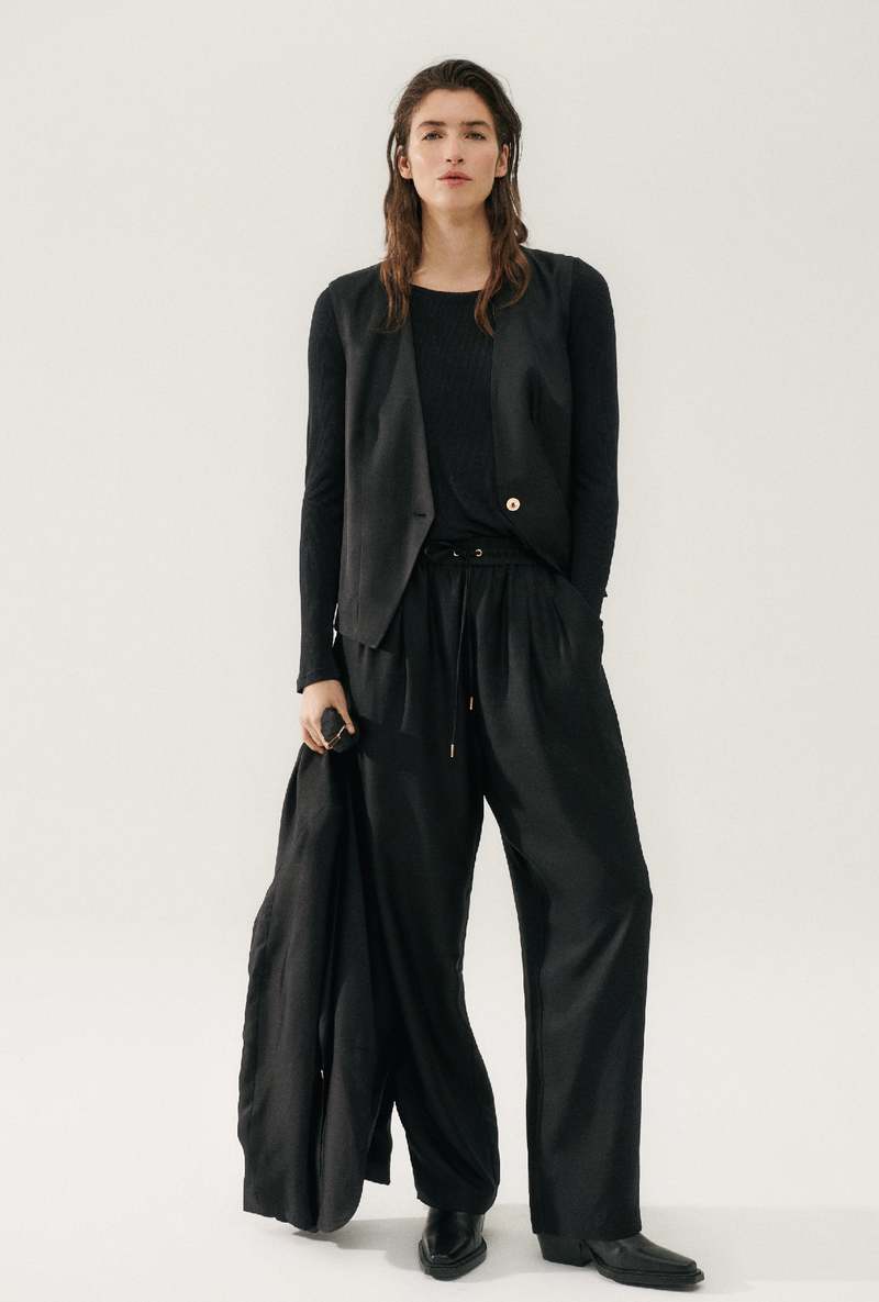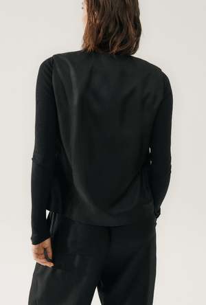 Enjoy a heavenly blend of twill and silk in this Twill Slouch Vest. Featuring a singular button closure and tailored fit, this vest was made for mixed dressing. Wear it with our Twill Slouch Pants or Twill Slouch Shorts for an elevated set. Material: 100% Silk Twill, 22 momme Lining: 100% Organic Cotton Voile Colour: Black
