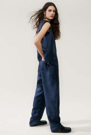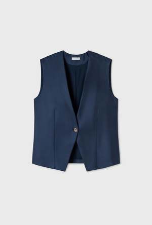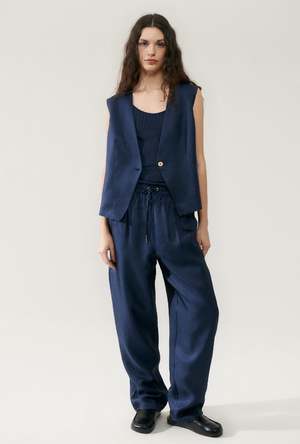 Silk Laundry vest crafted in 100% silk twill detailed with a deep V-neck collar and a singular button closer. Cut to a loose tailored fit with a below the waist length. - Material: 100% Silk Twill, 22 momme - Lining: 100% Organic Cotton Voile - Care: Hand wash in cold water or dry clean - Slight sheen, subtle texture - Wide shoulder - Long torso - Deep V neckline - Single breasted one button at waist - Internal French seams - OEKO-TEX certified - Relaxed fit - Typhaine is 178cm / 5'10 and wears a size small