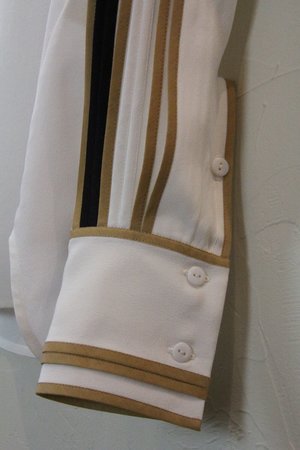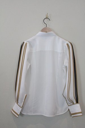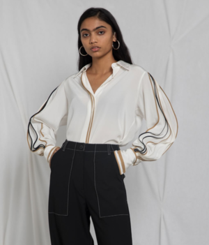 Silk button shirt with pleated sleeves. Color : White with pleats in black and caramel Material : 100% Silk Crepe A contemporary ready-to-wear label by Ruchika Sachdeva, BODICE stands for modern, relevant and effortless elegance. The clean silhouettes combine impeccable tailoring with high-quality textiles. The designer was awarded the prestigious International Woolmark Prize for womenswear in 2018. **Please note silk is delicate and for that reason this garment is final sale