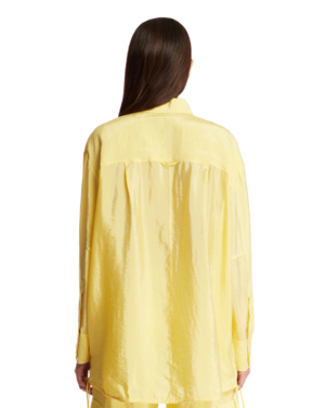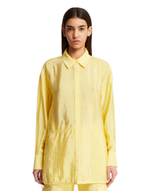 Simkhai Yellow Laylah Shirt. Crafted in a yellow rayon and tech fabric blend. Classic collar, long sleeves, buttoned cuffs, dropped shoulders, front button fastening, rounded asymmetrical hem. Ines is 178 cm and she is wearing size S.