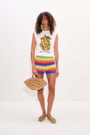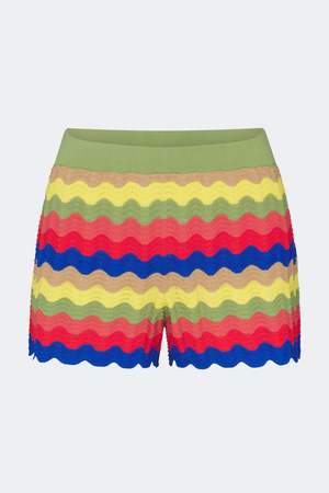 Mid-rise fitted knit shorts crafted in a soft pointelle stitch knit. Designed with colorful wavy stripes, a contrast waistband and hem, and a pull-on construction for easy, comfortable wear. Details Model: W5274-6093-96610 65% Viscose, 35% Nylon Imported Machine wash cold. Do not bleach. Lay flat to dry. Iron on low heat. Sizing True to size.