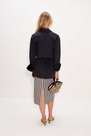 Stretch cotton poplin top with a cut-out back and adjustable tie for fit flexibility. A versatile piece that can be dressed up or down. Model: W3440-3169-90303 75% Cotton / 22% Nylon / 3% Spandex Lauren is 5'10" and wears a size S Bust: 31" Waist: 23" Hip: 35"