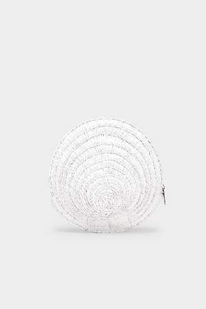 Paper straw material clutch in the shape of an oyster. Details: Model #: S1058-9257-10608. Composition: 90% Raffia Paper, 8% Iron, 2% Stainless Steel. Dimensions: Height: 24 cm, Length: 23 cm, Depth: 10 cm. Features: Interior pocket with cardholder, zipper closure. Imported.