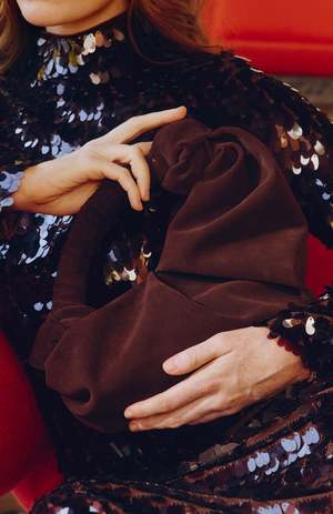 Suede handbag with custom knot detailing and magnetic closure. Details: Model #: S849-9040-91218 100% Cow Suede Sizing: Height: 13cm Length: 31cm Depth: 6cm Strap Drop: 10cm