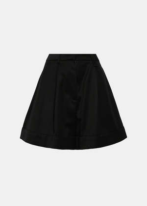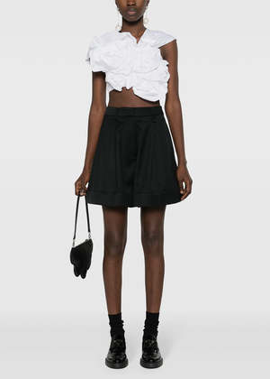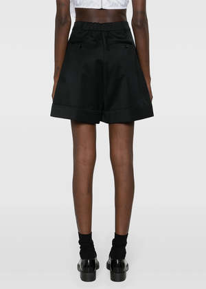 Virgin wool blend high-rise flared shorts in black. High-rise Hook and zip fly fastening Belt loops Pleat detailing Two side inset pockets Two rear jetted pockets Flared Turn-up hem Thigh-length 55% Polyester 45% Virgin Wool Made in Portugal.
