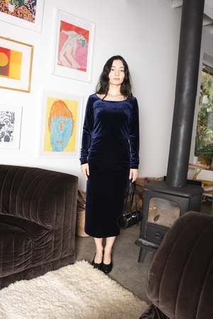 This full length skirt from German brand Simone Wild is cut in the softest, most lush velvet. It features a straight silhouette, elastic waist, and a slit through the back for ease of movement. Styled as a set with the matching shirt: Simone Wild | Velvet Basic LS Shirt | Navy. Composition: 90% PES, 10% EA. Care: Machine wash in cold water in a netted laundry bag to avoid pulls. Hang to dry or line dry. Made in Germany.