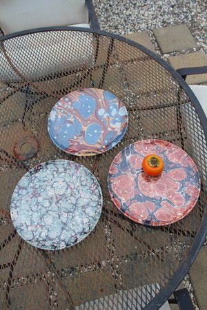 The patterns are derived from the traditional marbled end papers used in old books. The paper is commonly referred to as Turkish marbling or Ebru in modern Turkish. Plates are made from heavy weight easy care melamine, are dishwasher safe and BPA free. Great for using at the lake, camping, dressing up your backyard party, or gift giving a plate of cookies. The plates come in set of 3 multi patterned plates, including one of each of the marble prints below. 10.5 diameter.