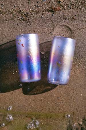 2 piece glass tumbler set made by Ontario legend Peter Gudrunas. Each of Peter's pieces are completely unique, his work bears a sense of strength and sincerity. Swirling like a mirage, his work is highly coveted. Each glass measures approximately 5/5.5" tall For ice cold - room temperature liquids or materials. Not recommended for hot liquids. Hand wash, not recommended for dish washer. Working with hand tools, glass is shaped while molten. To work with glass is to work with light, both reflected and refracted. Drawing inspiration from the glass itself- the material is fluid and transforms from something very responsive to something very fragile. In our technologically sophisticated time, glass retains even more of its historic mystery- every piece is made by hand and will never be duplicated.