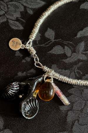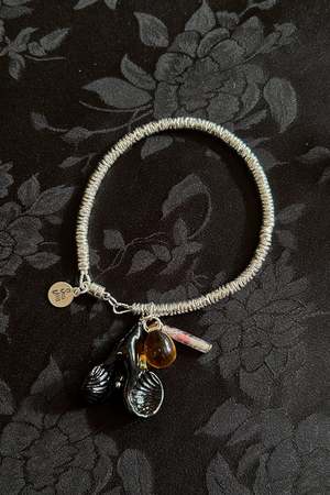 Sterling silver circular wavy charms looped through a cable wire into a bracelet, with a vintage Czech glass pendant in amber, purple, and black taking the form of an oyster shell amongst precious sea stones. Around 7" in circumference. Sterling silver findings and magnetic clasp closure with signature Sisi Joia tiny tag. Handmade in Paris.