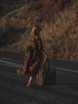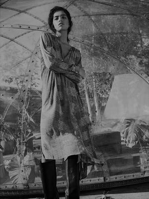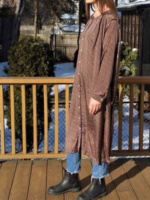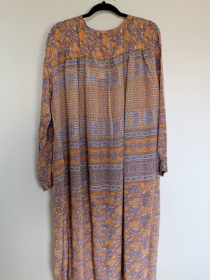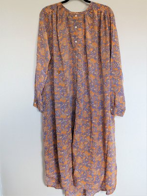 A Sissel Edelbo bestseller! This versatile comfy dress is made from several upcycled saris and redesigned into a modern nordic cut and style. It features a long, relaxed style that suits all body types and shapes. A seasonless fave and pretty option for working or lounging at home and ready for a day out. - Material: Fabric is from upcycled vintage saris. - Color: Multi-color print pattern with with yellow. - One Size - Waist 72", length front 47" and back length 48", arm length 24" - Features gatherings on the upper back and on the front shoulder part to give this dress a beautiful flowy look. Front buttons. - Each piece is unique and redesigned from pre-loved Saris. Due to vintage nature of the fabric that was reused, small imperfections such as loose threads, variations in color and small stains may be present. The small imperfections that can occur tells a story about the fabric's authentic life from the past. - Model pic for scale only and not the one for sale. SISSEL EDELBO was founded in 2004 by friends, Jeanne Sissel Thomsen and Christina Edelbo Petersen, with the vision of creating a fashion brand based on pure, sustainable values as well as their love for feminine and colorful prints. The brand is committed to sourcing and upcycling the finest vintage saris worn by Indian women for generations. They rework these beautiful fabrics into dreamy styles to last season after season. SISSEL EDELBO creates timeless styles that have their own unique story and shows both Indian heritage and the modern, nordic silhouettes. The collectsion combines colorful prints with comfortable playful styles for a modern boho vibe.