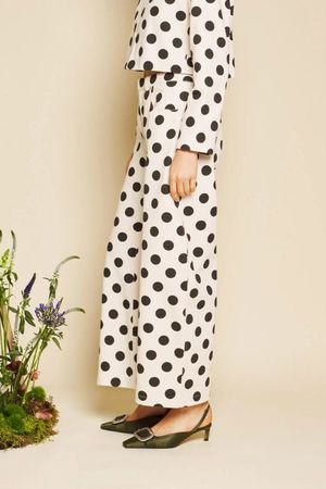 Scattered in charming polka dots, the Rene Spot Trousers feature a barrel-style leg and denim-style pant construction. DETAILS: - Barrel style leg - Denim-style pant - Front and back pockets - Belt loops - Polka dot denim fabric - Made from 100% cotton SIZE + FIT: - Natalia is 5'9" and wears a size US 4 (S)