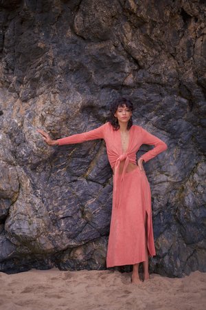 A soft coral colored skirt with a playful slit on the side. It is a blend of fashion and sustainability made with a soft cotton jersey for a comfortable and breathable result. Complete the look with the REKAWA BLOUSE