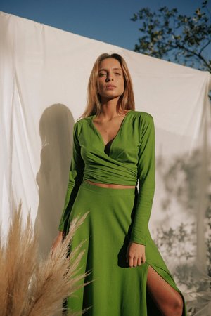 V-neck jersey wrap top ties together in the front made with soft cotton jersey available in three colours Complete the look with our TONGASS SKIRT Model height is 172cm and wears a size S