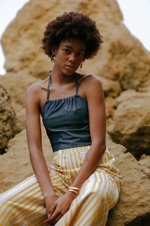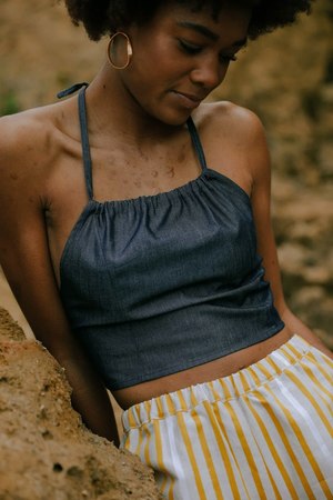 Halter neck top made from super soft tencel and cupro denim. Fastens in the back with a bow. Model height is 180cm and wears a size S.