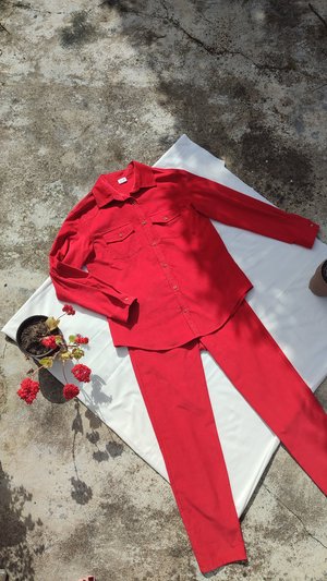 Red corduroy shirt. Can be worn as a shirt or a light jacket. With two pockets on the front. With wooden buttons. To add a special touch each off the buttons are sewn on with a hand embroidered flower.