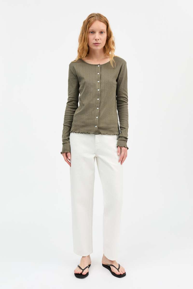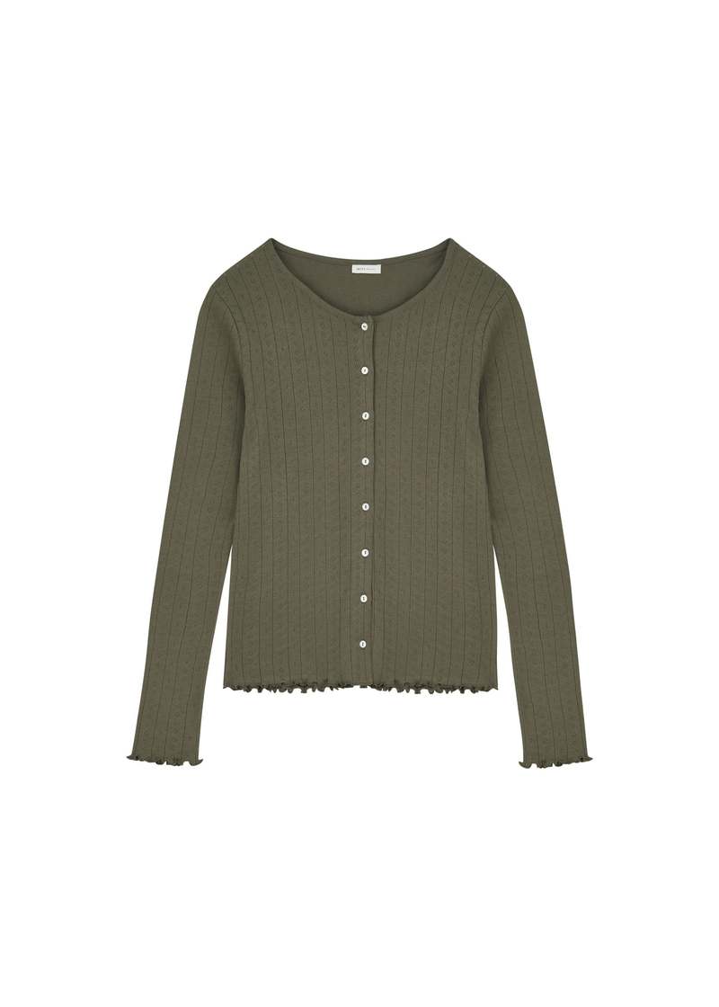 The Edie Cardigan in olive is a lightweight, breathable knit with a relaxed silhouette and classic button-front closure, perfect for layering over tees or dresses. Made from soft organic cotton, it offers both comfort and effortless style. Its versatile design makes it ideal for everyday wear or transitional weather. MATERIAL 100% GOTS-certified Organic Cotton Jersey COLOR Olive CARE Machine wash at max. 30 degrees ORIGIN Made in India.