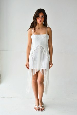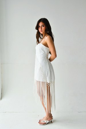Delicate and luminous, the Luster Fringe Dress is a celebration of texture, movement, and quiet ocean beauty. Hand beaded in-house with pale blue freshwater pearls, the bodice is crafted from ivory cotton eyelet featuring an intricate floral embroidered pattern, layered over a soft cotton lining for comfort and structure. A sculpted V-shaped silhouette flows into long ivory fringe along the hemline, creating movement with every step. Thin spaghetti straps and a low back keep the shape effortless and feminine, while an invisible zipper with hook-and-eye closure ensures a seamless fit. MADE TO ORDER: Each PEARLY Collection piece is thoughtfully made to order in small batches to reduce waste and ensure every detail is finished with care. Because these garments are produced individually, production time may vary depending on current production demand. The estimated shipping date for this piece is 24 weeks.