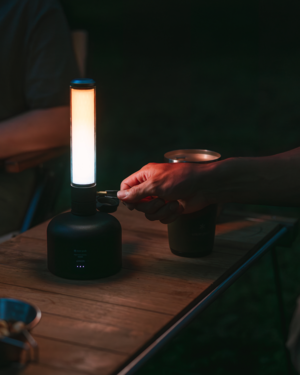 The GigaPower Tabletop Lantern is a multi-purpose camp lantern featuring white and colored LED lights within a cylindrical bulb for 360 illumination. Adjustable brightness is controlled by a knob on the side. Gradient color modes are inspired by sunrise and sunset, designed to match natural lighting at your campsite or bring a bit of nature into your home.